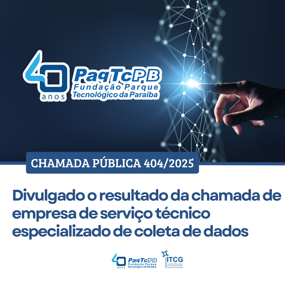 A Fundação Parque Tecnológico da Paraíba (PaqTcPB) divulgou o resultado do Chamamento Público referente ao Processo Administrativo nº 404/2025 – SGI nº 61335, que teve como objetivo a contratação de empresa especializada para execução de serviço técnico de coleta de dados, envolvendo a aplicação da Escala de Insegurança Hídrica (HWISE) e da Escala de Insegurança Alimentar.