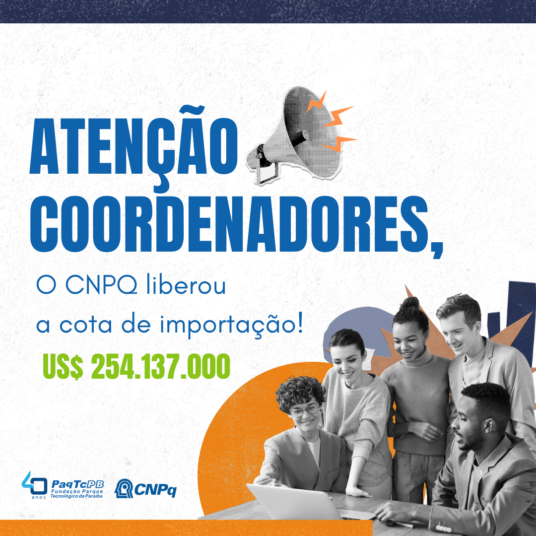 A Fundação Parque Tecnológico da Paraíba (PaqTcPB) informa aos coordenadores de projetos que o CNPq liberou o valor das cotas de importação destinadas aos projetos já aprovados.