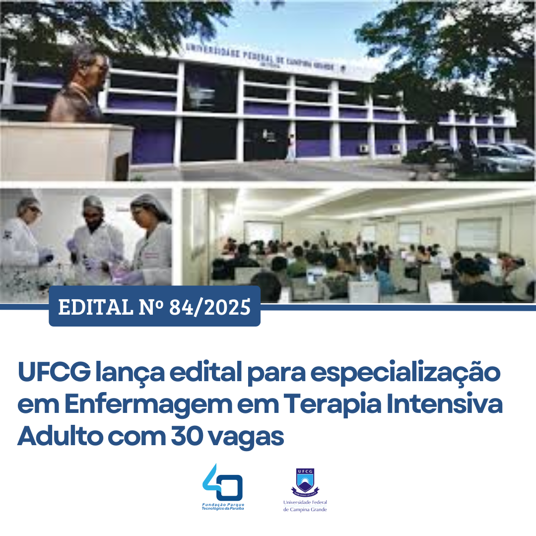 A Universidade Federal de Campina Grande (UFCG) publicou o Edital nº 84/2025, que trata do processo seletivo para o Curso de Pós-Graduação Lato Sensu em Enfermagem em Terapia Intensiva Adulto, ofertado pela Unidade Acadêmica de Enfermagem do Centro de Ciências Biológicas e da Saúde (CCBS), em Campina Grande.
